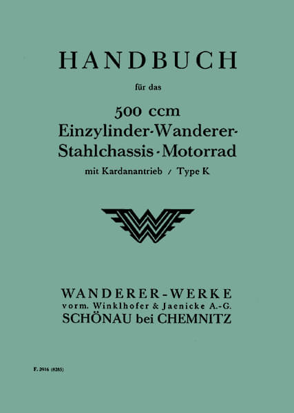 Bedienungsanleitung und Werkstatthandbuch für das Motorrad Wanderer Kardan 500, 1-Zylinder Stahl-Chassis-Motorrad, 16 PS, 4-Takt mit 3-Gang- Getriebe. Inhalt: Instandsetzungs- und Instandhaltungsanweisungen. Ausgabe 1928, 64 Seiten, DIN A5