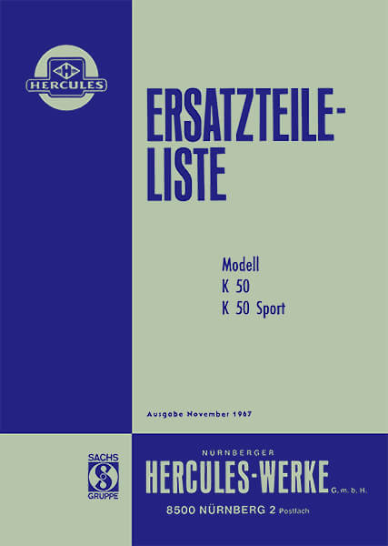Ersatzteilkatalog für Hercules K 50 und K 50 Sport, Fahrgestell - der Motor Sachs 50S ist in diesem Katalog nicht beschrieben - abgebildet und beschrieben. Ausgabe 11/1967, 32 Seiten, DIN A4