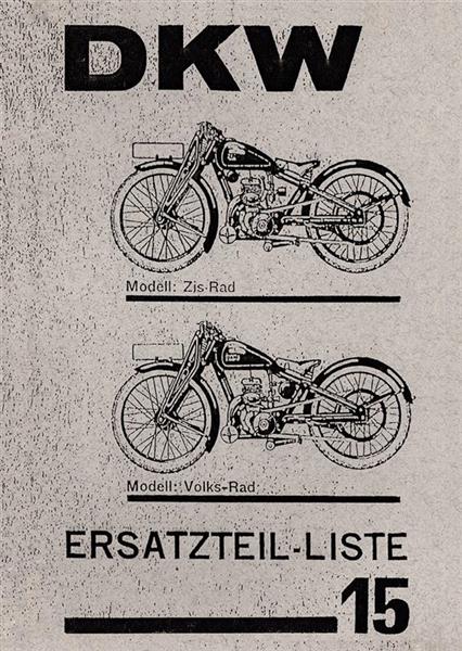 Ersatzteilliste für DKW Zisrad und Volksrad, Ausgabe 1930, DKW-Nr.:15. Inhalt: die Einzelteile sind abgebildet und beschrieben. 36 Seiten, DIN A5