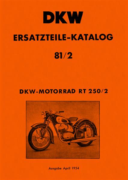 Ersatzteilliste für das Motorrad DKW RT 250/2, Ausgabe 1954, DKW-Nr.: 81/2, die Einzelteile des Motorrads sind in Explosionszeichnungen abgebildet und im Textteil beschrieben, 92 Seiten, DIN A5