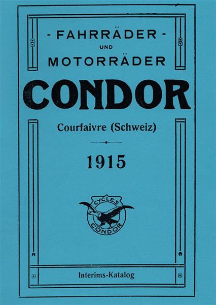 Ersatzteilliste für Condor Fahrräder und Motorräder Courfaivre aus 1915, abgebildet und beschrieben sind Fahrräder, Motorräder und Seitenwagen, die Einzelteile von Touren-, Renn-, Geschäfts- und Militär-Fahrrädern sowie von 1/2 Zylinder Motorräder mit 2,25/2,5/3,5 und 4 PS, Ausgabe 1915, 32 Seiten DIN A5