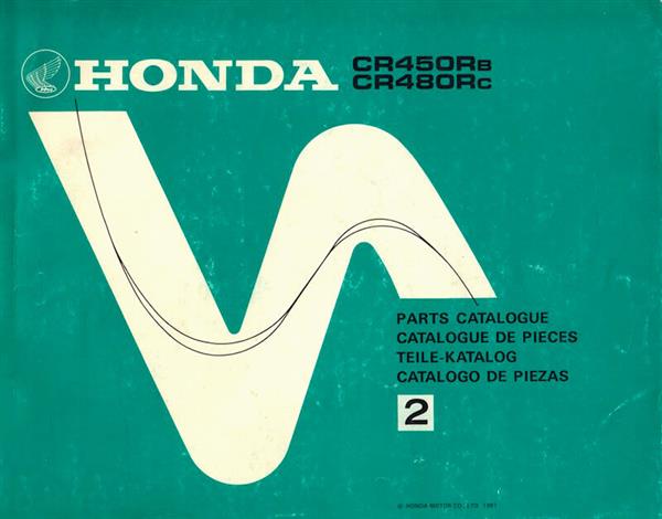 Ersatzteilkatalog für Honda CR 450 RB und CR 480 RC. Inhalt: die Einzelteile des Motorrades sind in Explosionszeichnungen abgebildet und beschrieben. 2. Auflage, Ausgabe 1981, 240 Seiten, DIN A4